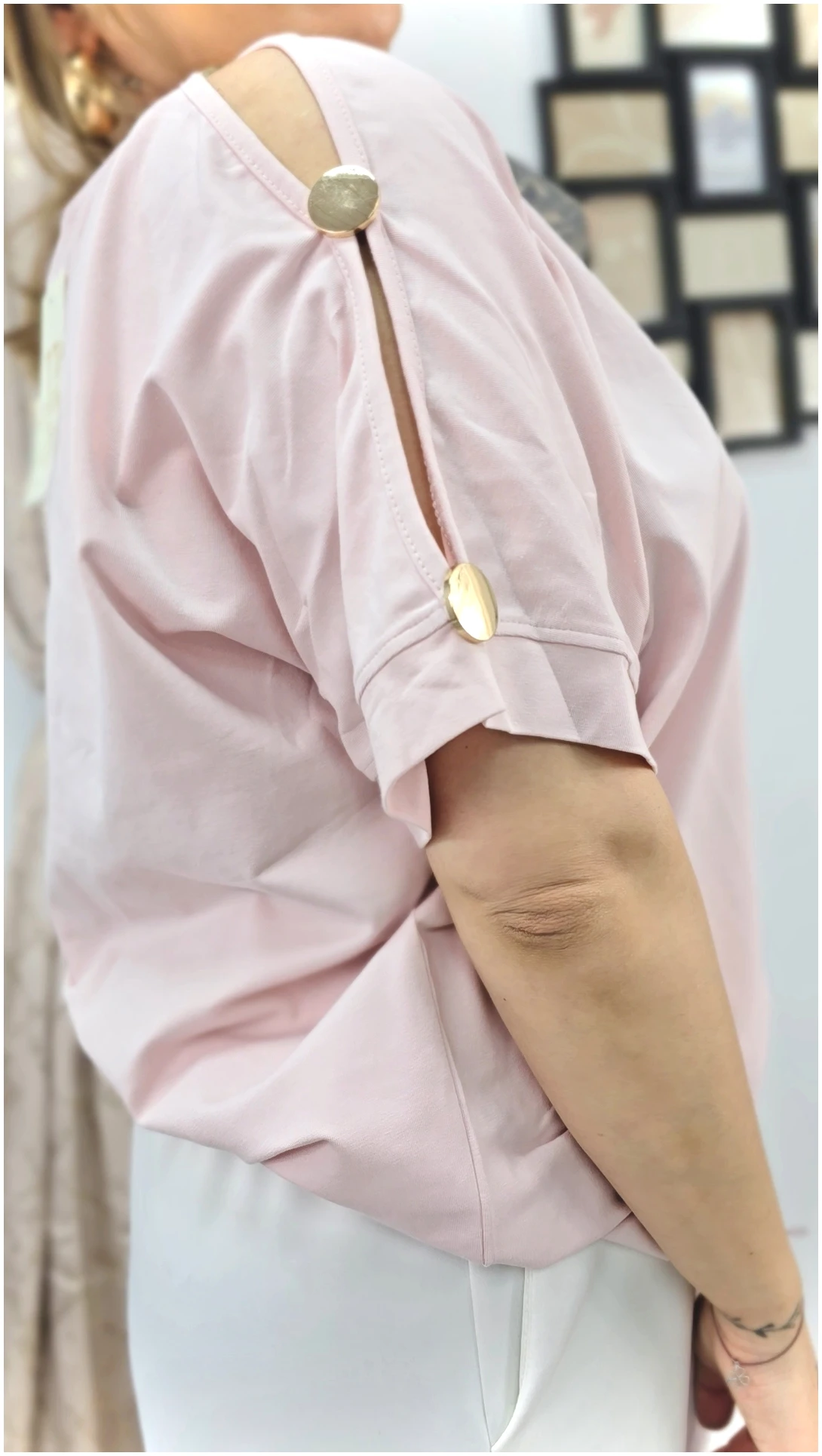 Stylowa, gładka bluzka z modnymi przecięciami na ramionach, które nadają jej lekkości i nowoczesnego wyglądu. Złote guziki stanowią elegancki akcent, przyciągający uwagę i podkreślający wyjątkowość modelu.