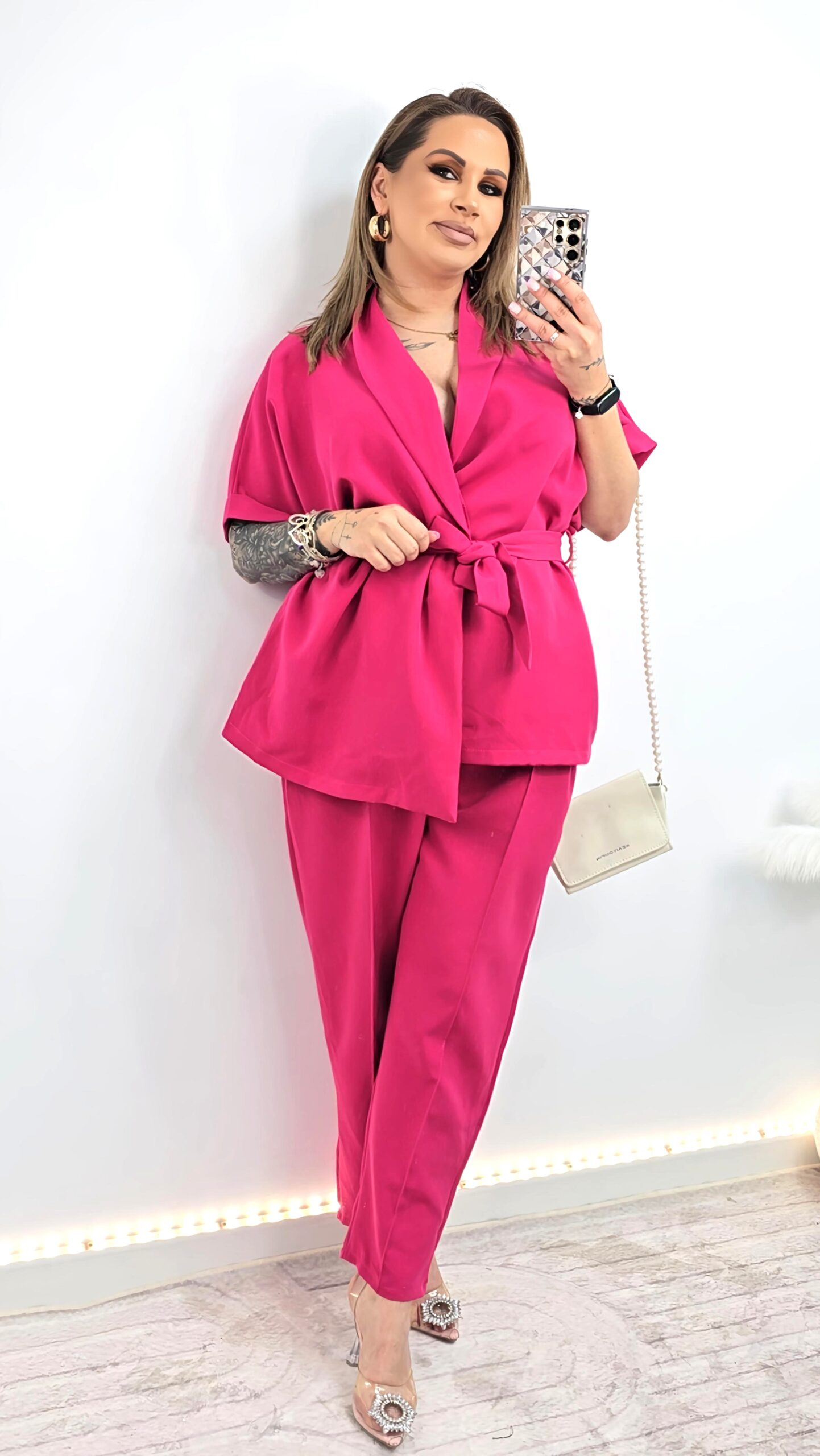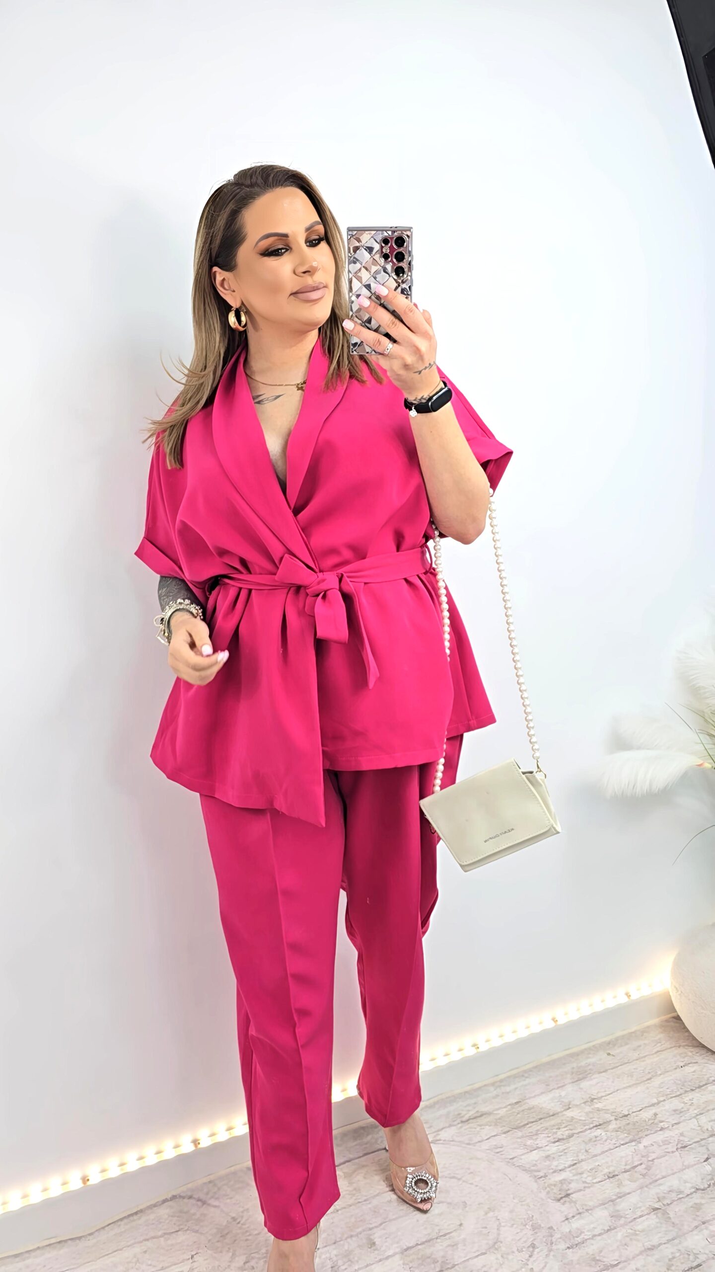 Całość tworzy stylowy, uniwersalny zestaw idealny zarówno na co dzień, jak i na bardziej eleganckie okazje.